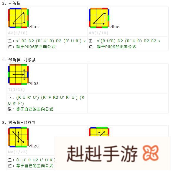 PLL是高级玩法CFOP里面的最后一步了,即对好魔方顶层的侧面颜色。PLL共有21个公式,简化版里只要记住8个公式就可以了。如果碰到8种情况之外情况的时候,用入门解法中介绍的调整顶层四角顺序的方法,然后再用3棱换公式解即可。