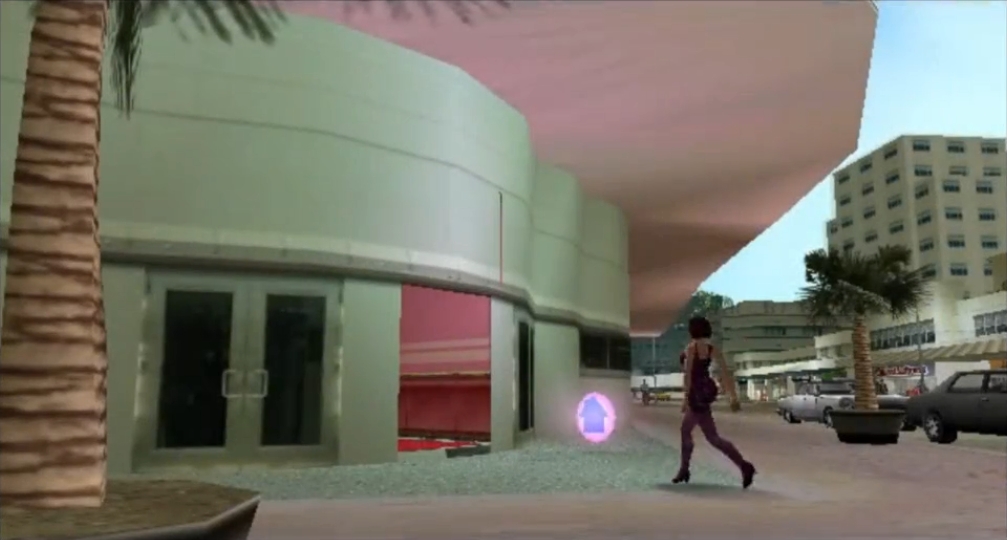 游戏的开始,首先我们要驾驶汽车前往地图中的红点处,现在我们已经到达宾馆的大街,进入后看到一个类似于(磁带)的东西,小伙伴们在完成任务后,或是需要下线,就可以到这里存档,下次进入游戏就会直接从这个存档的时间开始游戏进程,当然后期可以购买很多的房产,我们也可以在房产处,任意存档!