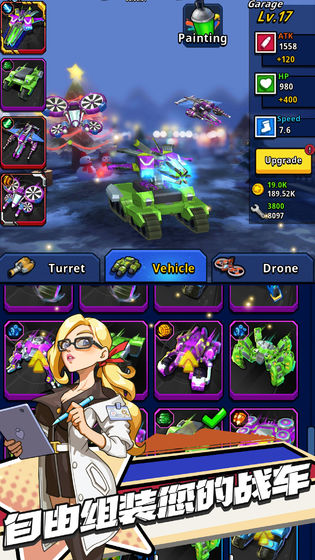战车方面的配置也允许玩家进行自由组装和替换了,可以更换四种部位——履带、主炮、副炮、装甲,根据自己的需求和想法搭配也是一个不错的选择,而且游戏还有幻化和涂装功能,可以设计出自己最爱的坦克样式。
