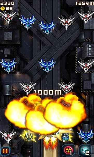 3、完美再现超爽的射击快感,可成长变形的超COOL战机,全屏华丽弹幕,片杀秒杀敌机的快感这一切尽在。