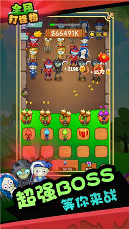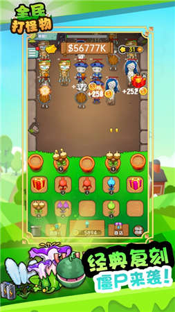 全民打怪物游戏是一款休闲放置射击游戏,游戏画面十分精致,玩法与植物大战僵尸相类似,玩家可以很容易上手。全民打怪物游戏中有许多的植物种类,每一种植物的觉醒能力是不一样的,玩家只要滑动手指就可以操纵各类植物发动攻击,消灭各种可怕的僵尸。