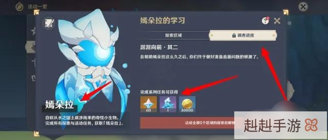 点击上方的调查进度选项,完成所有的探索任务和活动任务,即可获得嫣朵拉。