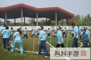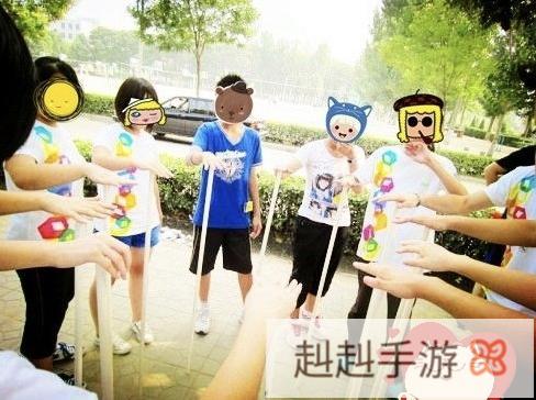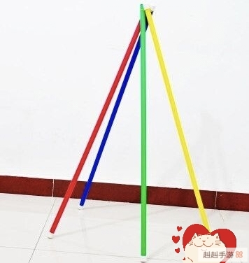 2.宣布开始前,双脚开立,不允许移动,开始后大家按自己相同的口令,在保证自己直立杆子不倒的前提下,迅速移动步伐按顺时针将右手掌心按到相邻的同伴的杆上,保持不倒;