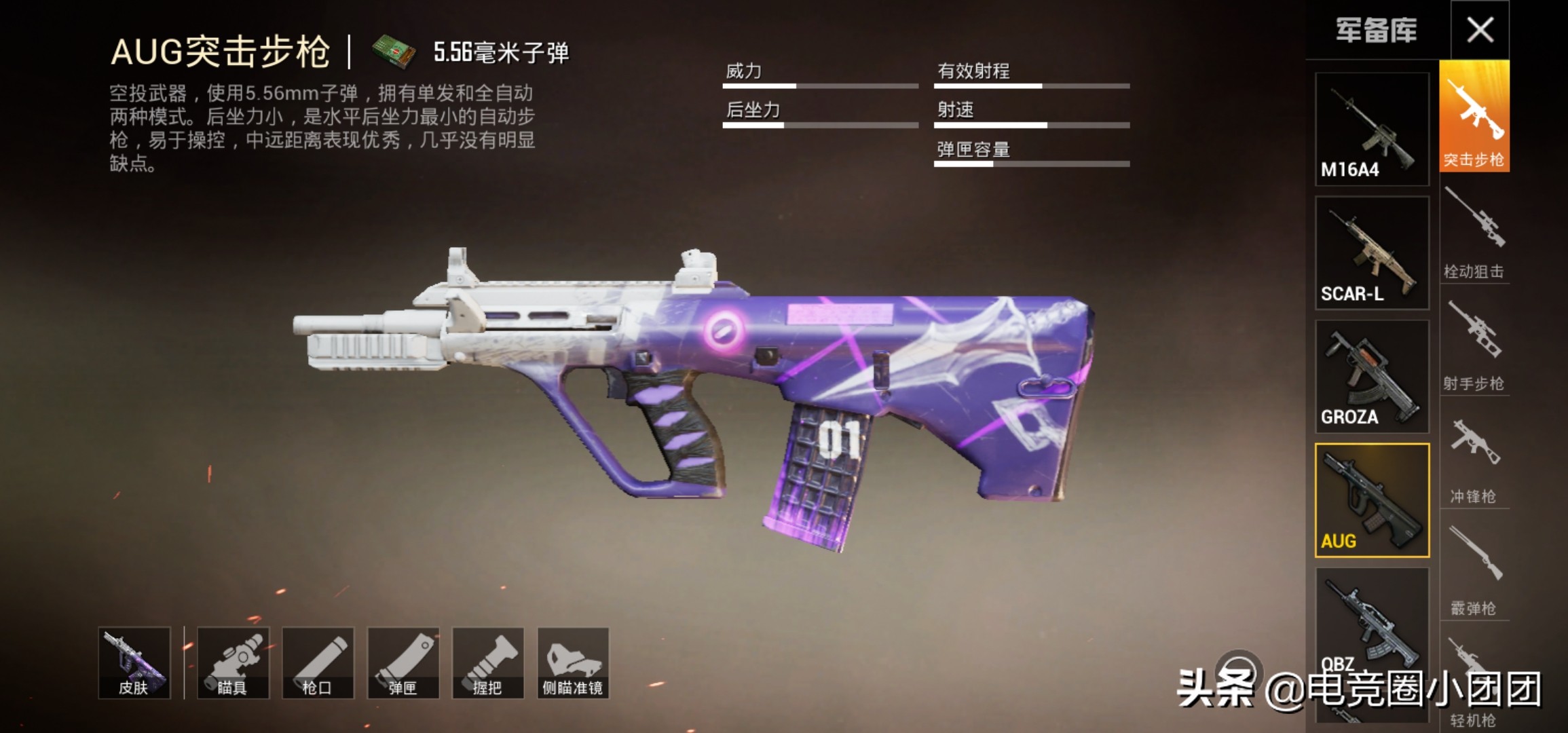 AUG作为一把空投枪,在综合能力上要略强于M416,特别是在没有配件的情况下,这两把步枪的差距会特别大。在满配的情况下,AUG在稳定性和后坐力方面都很不错,非常适合新手。但是这把步枪在新手玩家手上并不多见,反而是高段位玩家经常用这把步枪装上4倍镜用作中程作战。特别是配上消音,完全可以1V4。