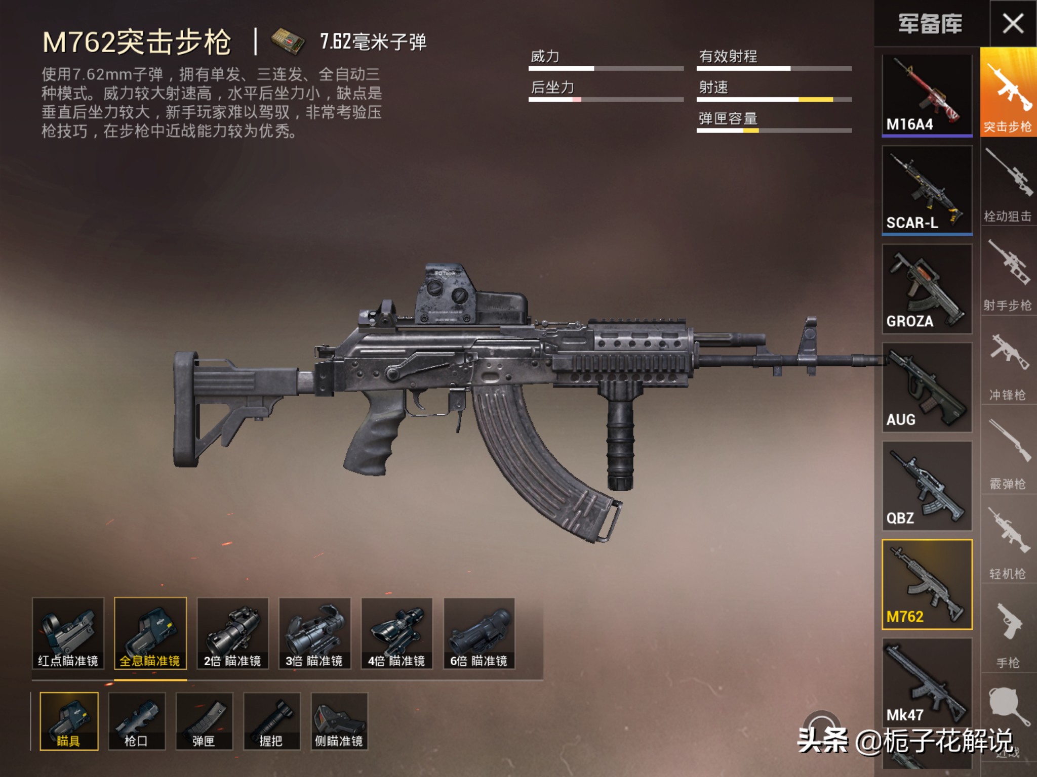 准镜一般情况下只能选择红点或者全息,可能很多玩家会认为AKM机瞄更加好用,这也是AKM的一个硬伤,自动拾取会自动拾取准镜,这恐怕是很多AK玩家的烦恼吧,在最佳配件的情况下,M762的DPS秒杀任何步枪系列,综合性能十分优异,在瞬息万变的战场上可以以最快的速度击倒敌人,而且很容易爆头,因为自身属性后坐力的原因,输出量极强。