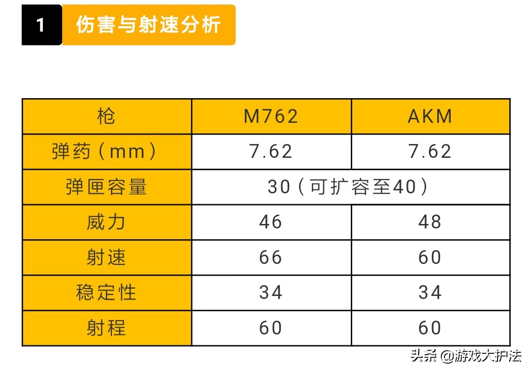 首先,我们来做一个M762与AKM的数据对比,毫无疑问这两把步枪使用的都是7.62毫米的子弹,而这两把步枪的主要差异表现在威力与射速方面,AKM的威力是48,略高于M762的46,而M762的射速为66高于AKM的60,也是玩家们更喜欢使用M762的主要原因。