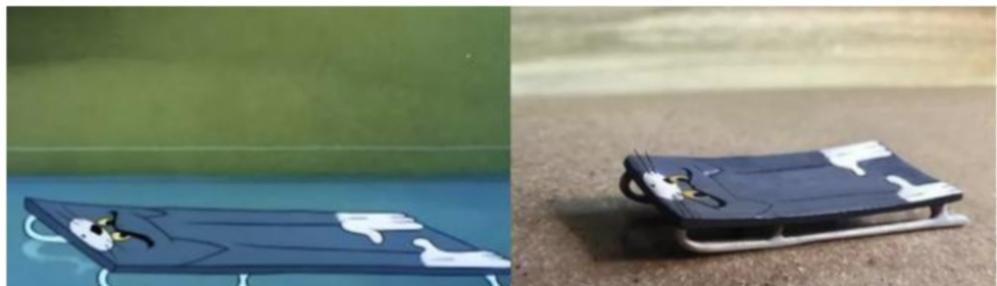 在猫和老鼠动漫中,汤姆曾经被各种利器打伤过,而这个毛巾状的手办就是它在追逐杰瑞的时候不小心跑到了卷刃机里,结果就变成了一层一层的毛巾状,虽然比楼梯状的更顺滑一点,但很明显卷刃机是很危险的,小朋友可要离远一点。