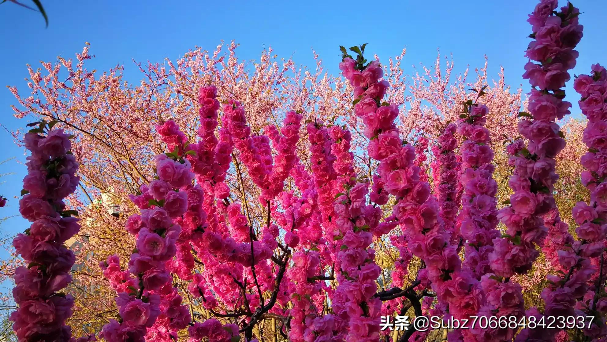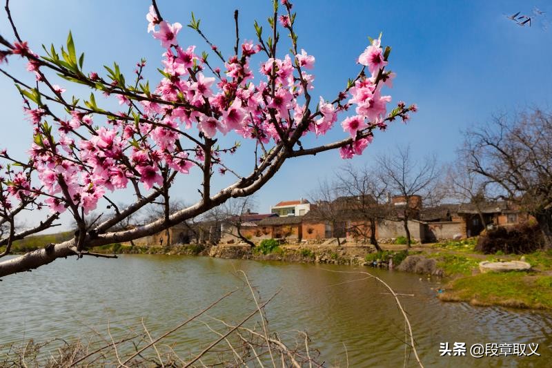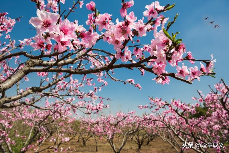 如何用摄影来拍出碧空俯瞰春容绚,苍穹展翅桃花漫的画面,本人认为:1、本画面的主体应为桃花漫,对焦点应为桃花,表达的氛围为桃花“漫”;2、碧空为背景,天空是蓝色;3、苍穹展翅,天空有鸟,当时拍摄没有,可通过后期,在合理的地主补上,保持画面的平衡;4、本拍摄采用小光圈9-16较好,对焦点桃花,花朵鲜艳细节清晰,碧空蓝天;5、测光点应为天空,确保碧空蓝色饱满。6、以下两张图,重点突出了一枝桃花的鲜艳富丽,分别用桃林和村庄作陪体,碧空和鸟作背景,应该基本表达了碧空俯瞰春容绚,苍穹展翅桃花漫的画面诗意。