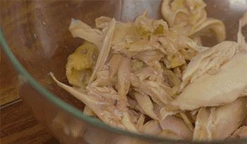 蒸好出锅,划一下重点:盘子里的鸡汁留着。鸡拿去晾成温热状态,不然现在手撕太烫。差不多了就开始撕,撕的过程太过暴力,给大家留有丰富的想象空间,这里就不仔细描述了。