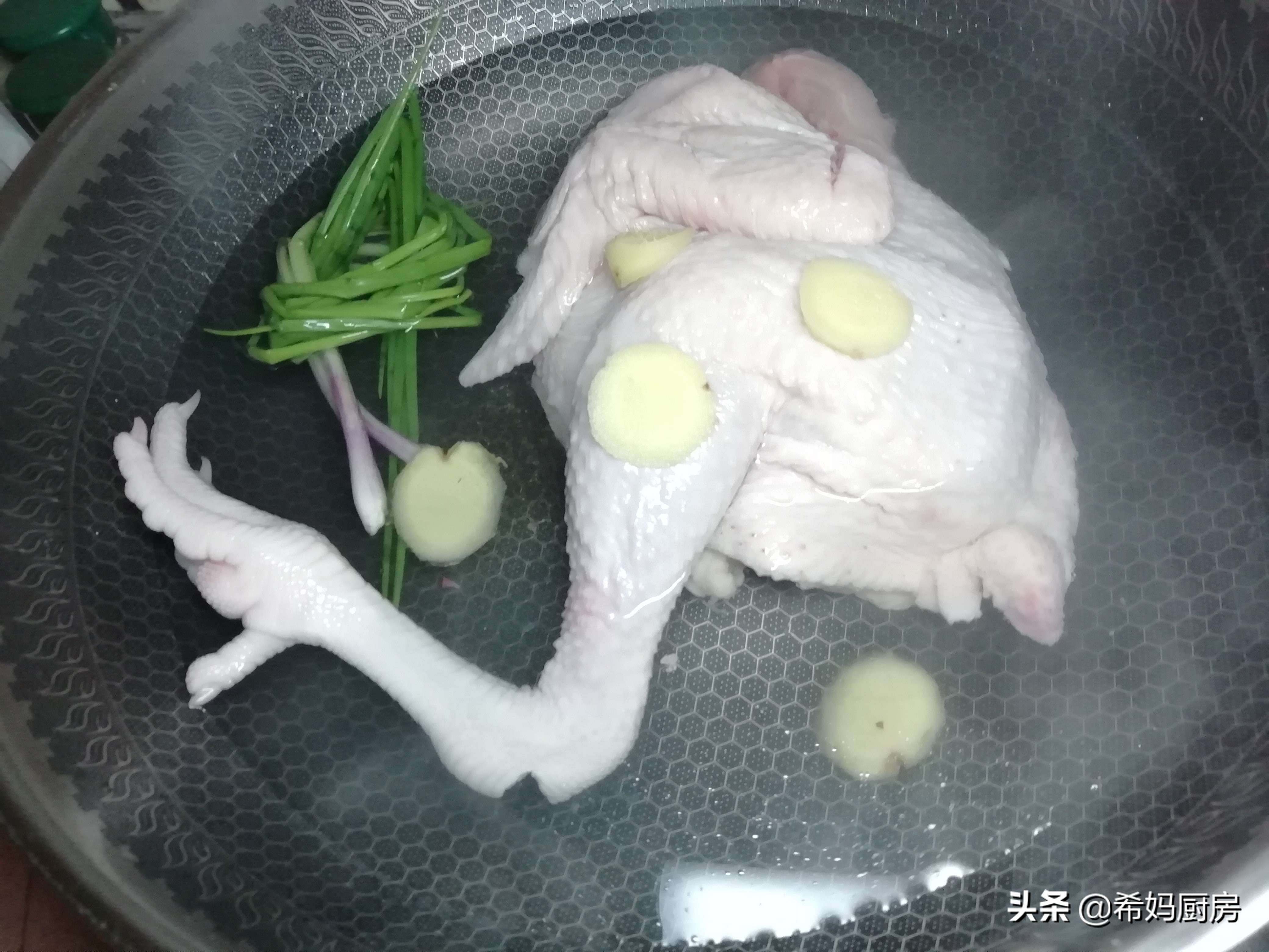 第一步,半只嫩鸡,冲洗干净,锅中放冷水,将半只鸡都扔进去,放几根葱打结后也丢进去,生姜去皮切片也放进去,再放入一瓶盖的料酒,开大火把水烧开。(--如果鸡太大只,可以在鸡爪和鸡腿的连接处划一刀。)