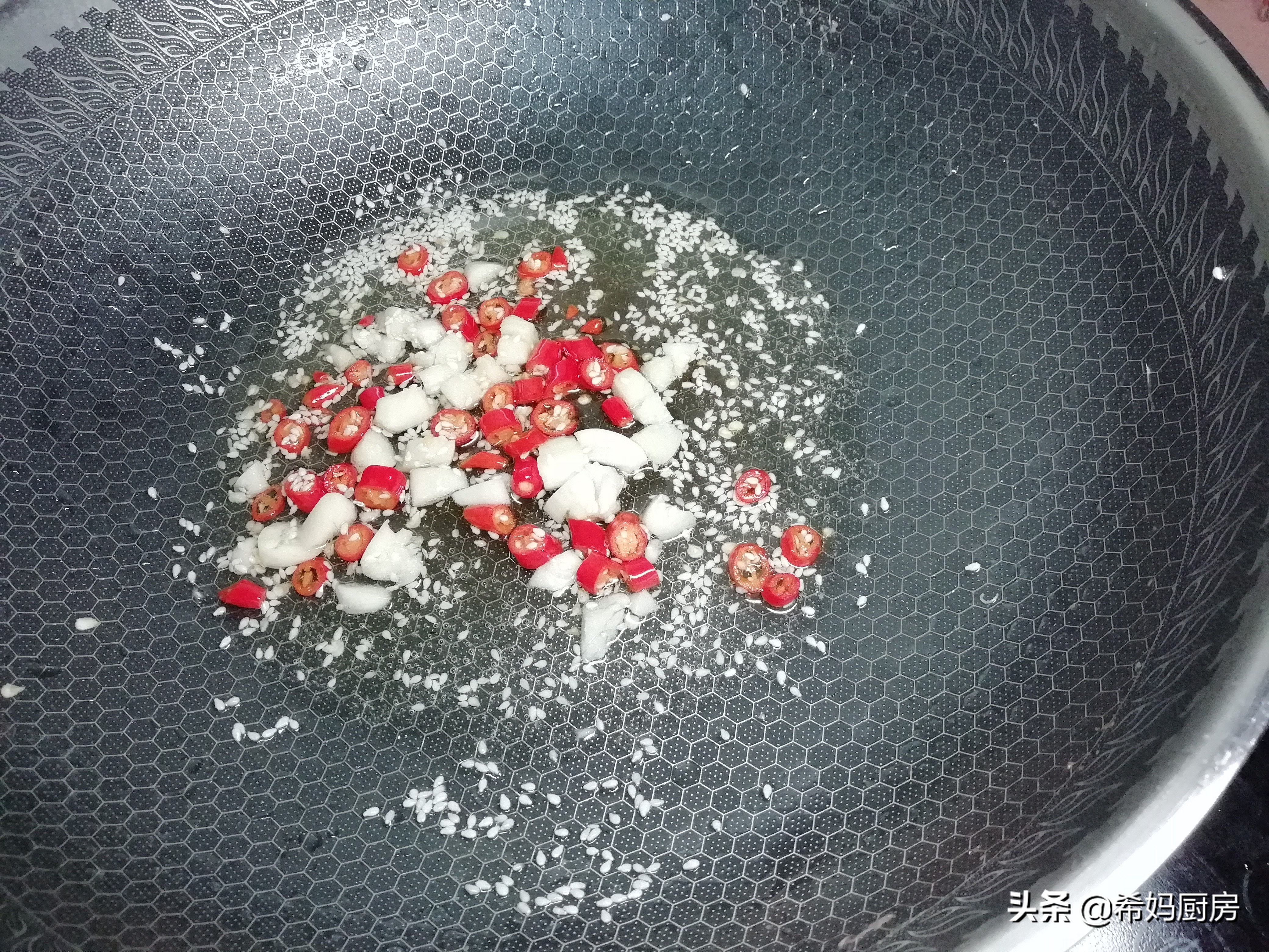 第四步:锅中烧热油,快冒烟时关火,撒一把白芝麻炸香,之后把蒜末和辣椒都放进去爆香。