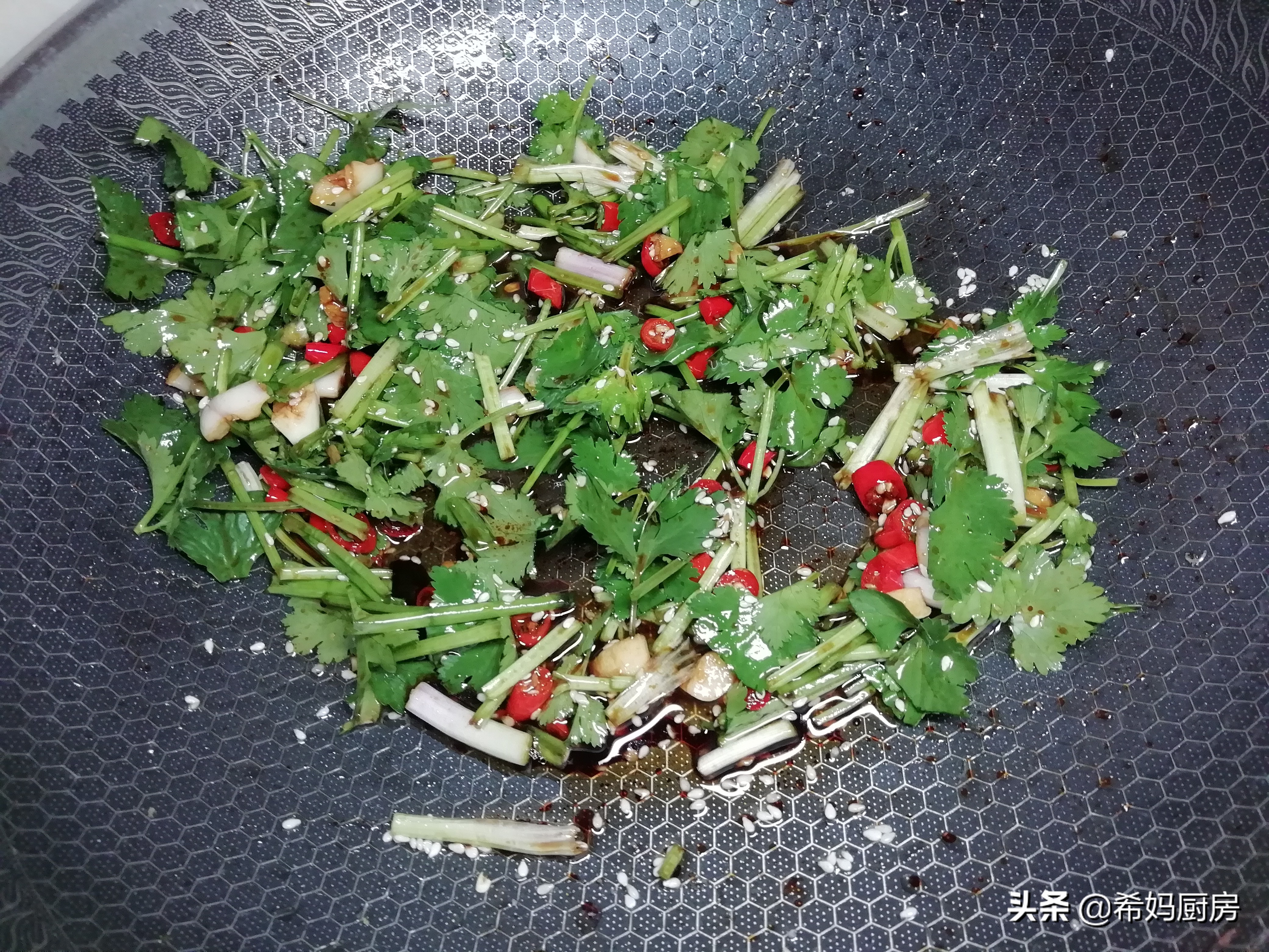 第五步,开始正式调味,先放生抽、食盐、花椒油、白糖搅拌均匀后,再加入一些辣椒油,之后放入葱花和香菜段。