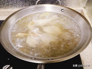 2、锅中倒水多许、放入葱段、姜片、2勺料酒,水开煮沸,用手捏住鸡头或者鸡脚,将鸡身放入开水中浸汤,每隔几秒钟将鸡提出,这个过程反复几遍,鸡表皮变色定型,即可