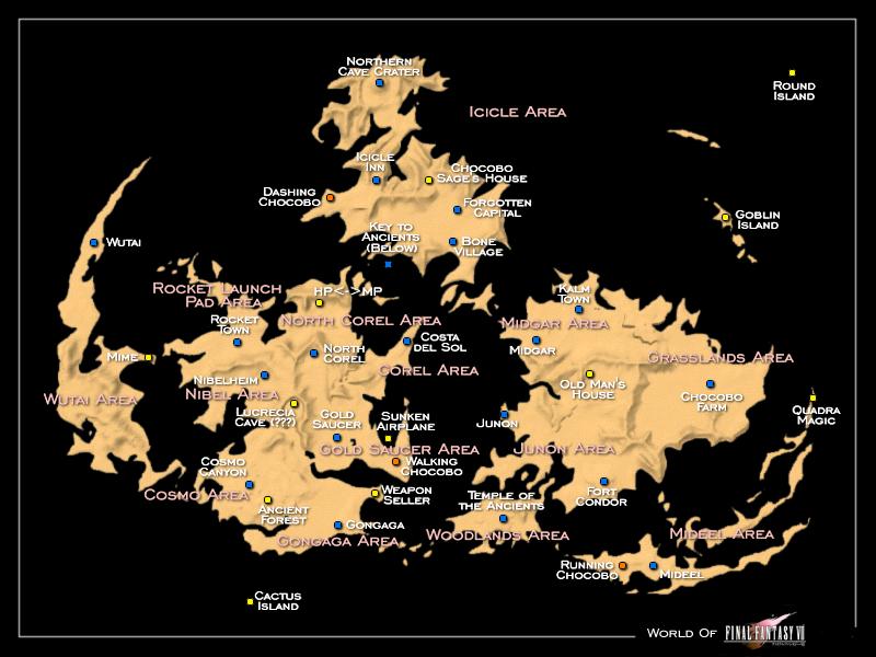 消耗品游戏中的道具沿用了之前设定,各类道具可以通过购买、探索等多种方式获得。场景地图游戏由多个区域地图组成,部分区域地图中包含多个城市、迷宫。玩家进入游戏后可以通过步行前往,乘坐陆行鸟、飞空艇等。城市区域地图由许多不同的城市、村庄组成,如米德加、卡姆镇、陆行鸟牧场、金碟游乐场、武器职人的小屋、贡加加镇、尼布尔海姆村、火箭村等,游戏中大部分剧情都在城市中触发。各城市又包含许多不同的商店,所贩卖的物品视商店种类而定。