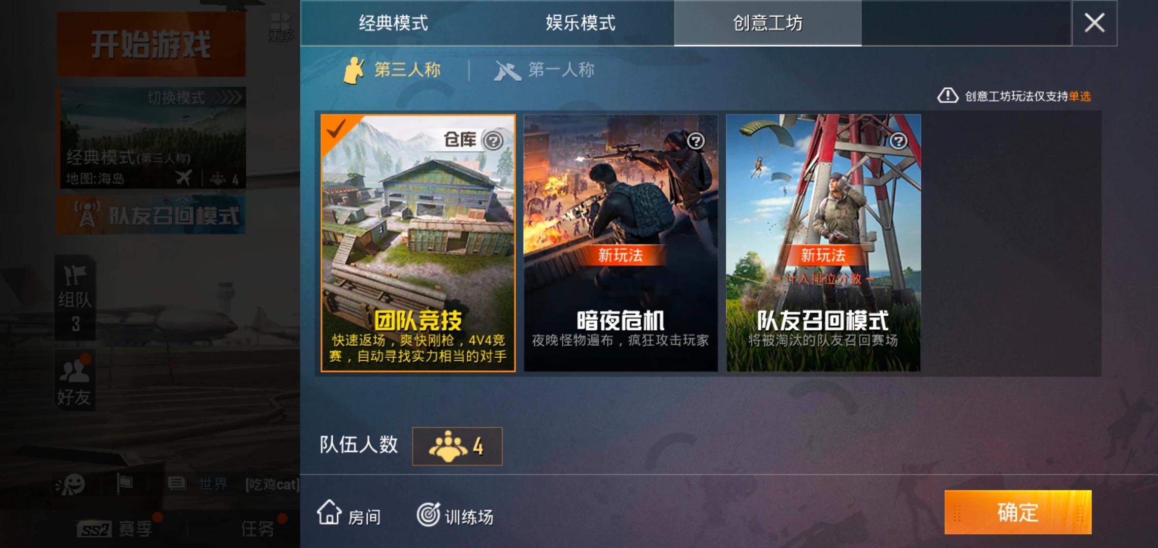 第二,创意工坊,团队竞技,这个也是练习枪法,反应速度和走位的,这里枪械有多种选择,喜欢用哪种枪械就拿哪种枪械,比娱乐模式中固定枪械要人性化很多,唯一缺点就是不能用陀螺仪,如果你能每局能灭掉十五个以上就可以出师了!