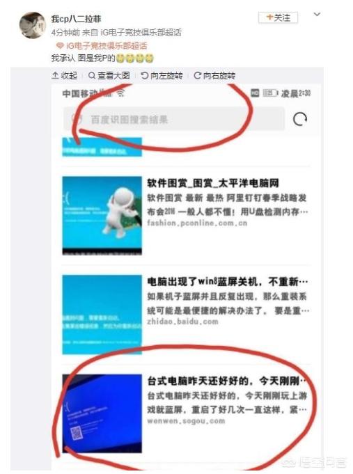 但事情很快就有了翻转,又有网友在IG超话下面爆出了一张截图,表示这张蓝屏的照片根本就是IG管理层临时从网上找的,从网上都能翻出来一模一样的图片……