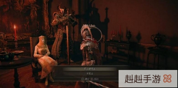 传送到火山官邸后,往前走,和里面坐着的女人对话,她会问你愿不愿意觐见王,这时候要选择愿意觐见。
