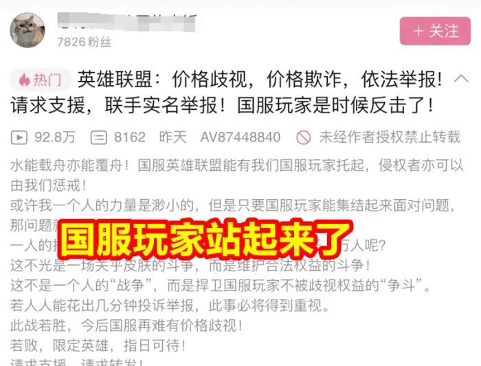 而如今这个领导者已经出现,那就是B站大佬“想待在幼儿园的米饭”,他制作了一个名为“价格歧视,价格欺诈,依法举报!请求支援,联手实名举报!”的短视频!在这个视频中,这位大佬揭露了国服策划的所做作为,其中最重要的就是价格歧视,在除了国服以外的其他服务器中,春节限定皮肤的价格都在70RMB左右,然而国服最便宜的一款皮肤都要19900点券,而这个视频在短短1天时间内就获得了180万玩家的支持!