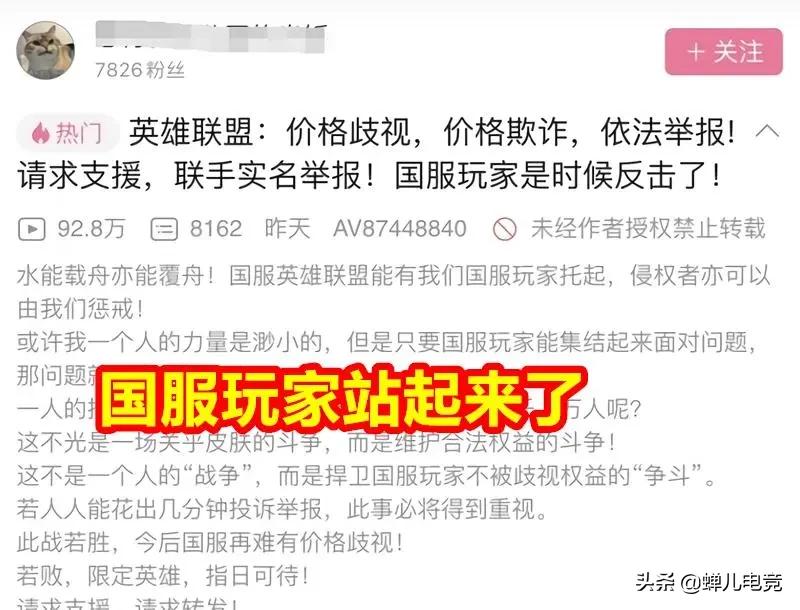 国服策划做出这样的事情作为国服玩家相信没有一个可以受得了的,有句话说的好:哪里有压迫,哪里就有反抗。最近就有一个人发表了一篇帖子:英雄联盟:价格歧视,价格欺诈,依法举报!请求支援,联手实名举报!国服玩家是时候反击了!一时间很多国服玩家都非常支持这个玩家的做法。