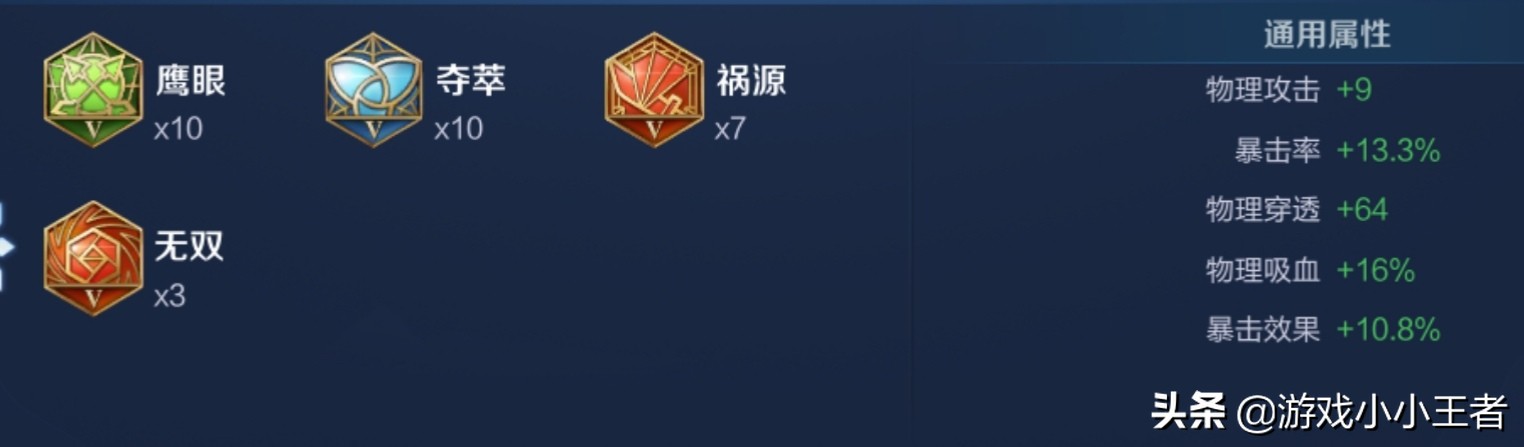 夺翠铭文提供前期的续航,鹰眼保证了物理穿透,3无双提供暴击效果7个祸源保证了暴击率。