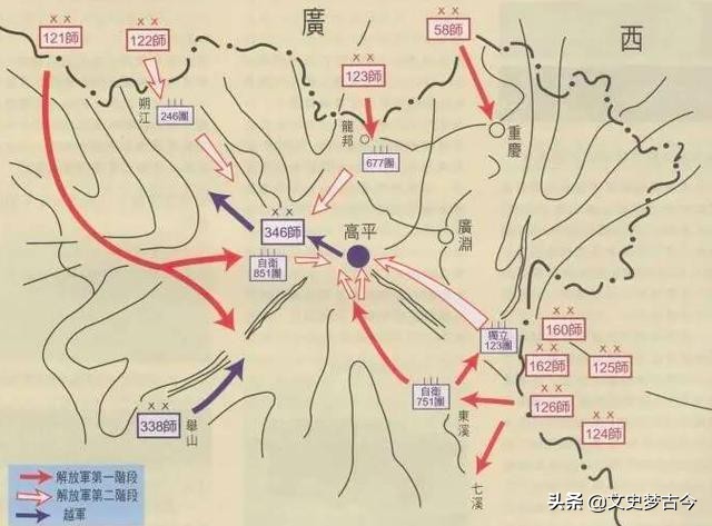 加之,博山坡度较缓,山上树木又出奇的稀少,以致于视界开阔,为越军346师构筑工事提供便利。越军在此布置重兵,形成了多层火力,给124师带来了不少麻烦。固辉沉着指挥,令所辖3个团进至博山附近,形成了兵临高平城下的威逼态势。