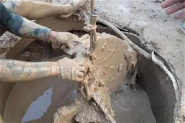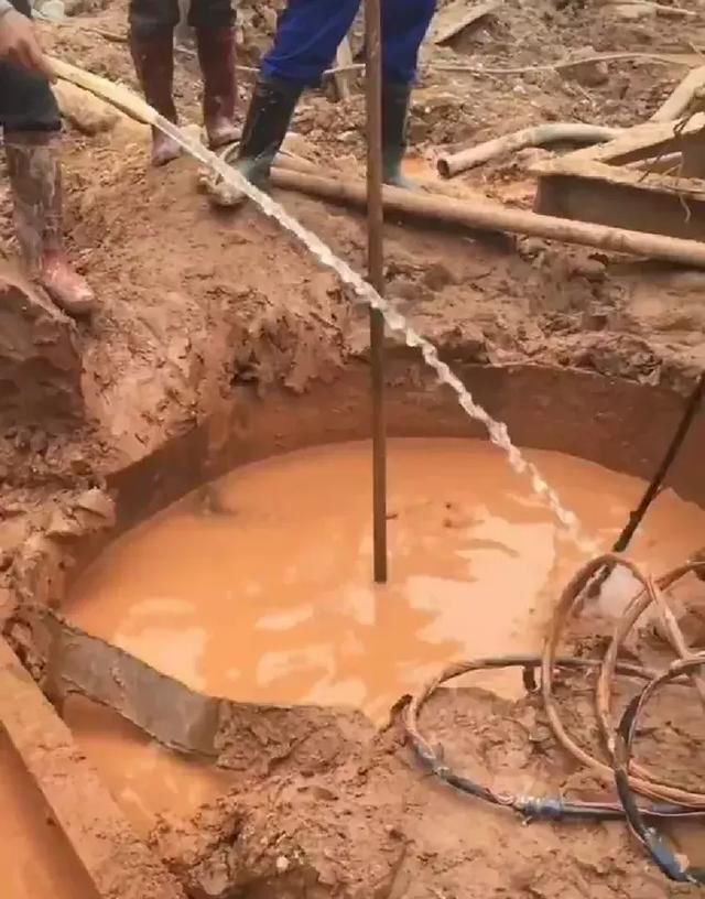 一切准备就绪后就要下去了,在井里不全是水,基本上是粘稠的泥浆。所以在里面根本看不见东西,水鬼们是摸索着工作的,这个过程全凭感觉和经验,由此也可见这份工作的不易。