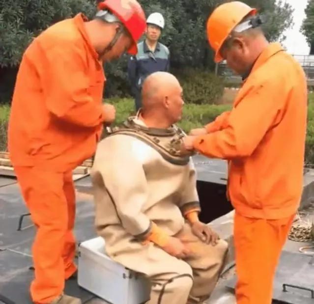 就是下到泥浆里捞东西的人,一般都是捞钻头,他们穿着配重潜水服下到几十米深的泥