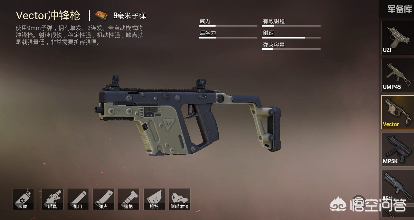 Vector冲锋枪,维克托,射速快,稳定性强,机动性强!缺点是子弹少。现在版本用的是9毫米子弹,加上扩容也有33发子弹,也还可以了。