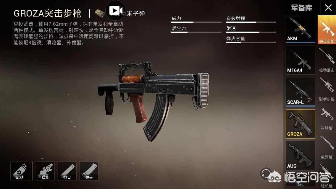 我要说的这把枪是一把空投枪,GROZA玩家都叫它狗砸,使用7.62mm子弹,拥有爆炸的射速与威力,基本属性包括基础伤害,出膛速度都与AKM一样,可是在射速方面,它可是远远高于AKM的,最主要是它的后坐力和你们的信仰M416是一样哒。