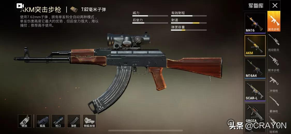 理由:这把枪也是刚枪玩家的不二选择,在和平精英里深得玩家青睐,AKM射速快,威力大,射程远,他绝对是和平精英里威力最大的自动步枪了,他由于射程远因此在游戏里有部分玩家把他调成单发当作狙来玩,但是他也有不足的地方,那就是稳定性不好,不适合远程的钢枪。