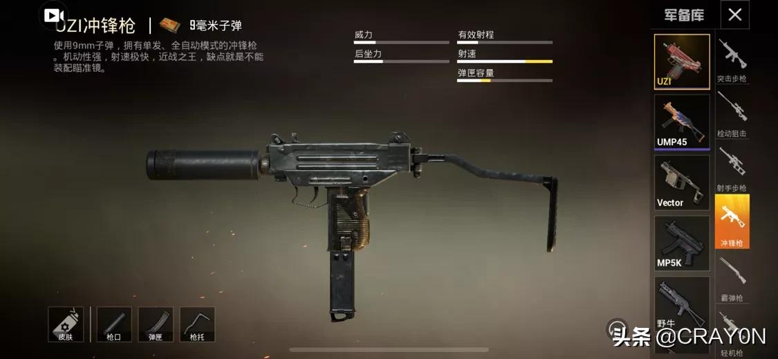 野牛冲锋枪,单个弹夹容量最大,高达53发,持续输出能力很强,射速偏慢。UZI(乌兹)的射速是冲锋枪里最快的,近距离爆发能力无敌,缺点就是不能装瞄具。拥有断剑之称的维克托,不仅近距离爆发强,而且能装配各种武器配件,但是在没有扩容弹夹时,弹夹容量太低。