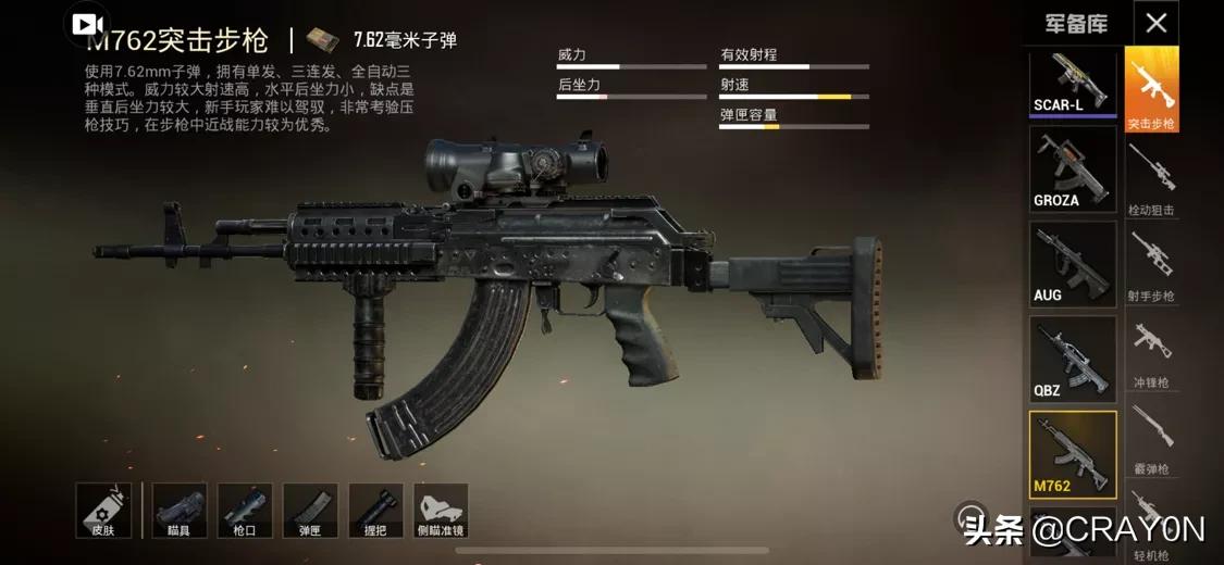 自动步枪:5.56系列>7.62系列,随着熟练度提高,可以逐渐偏向于7.62系列,而7.62系列中需要先熟练使用AKM以后,再开始M762的练习。