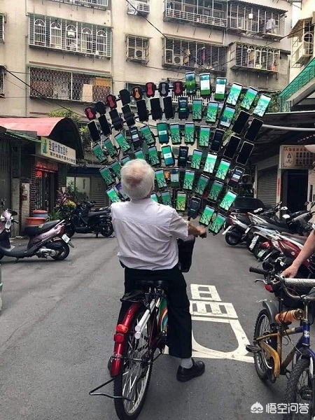 2019 年的时候,他又升级了一辆自行车,像孔雀开屏似地在自行车手把上罗列了 45 部智能机。