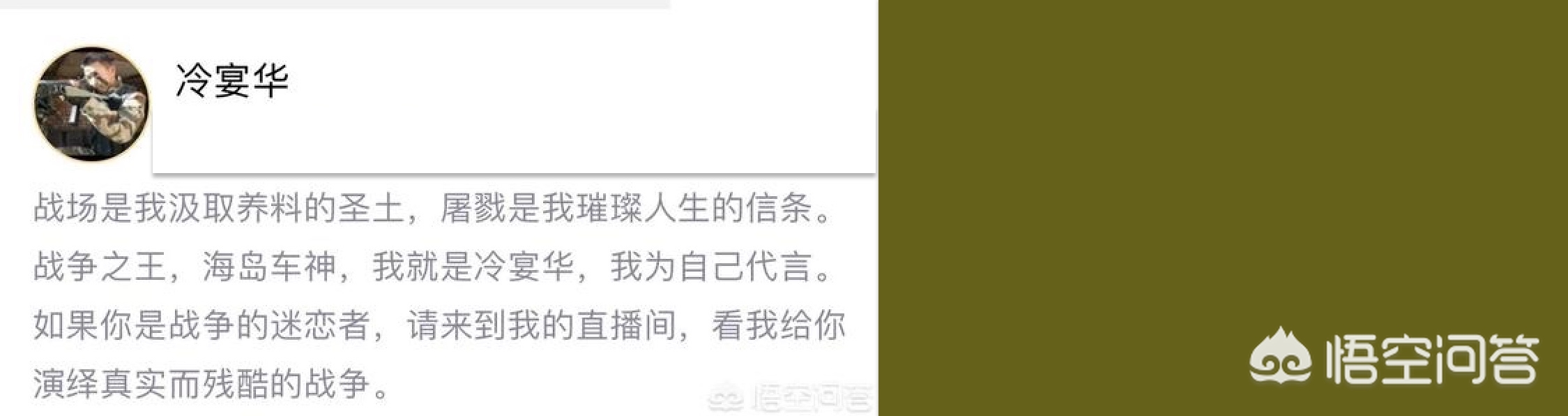 在冷宴华主播的封面上,他的一段表白很吸引人。有人称他是退役军人,所以,在字里行间显示了某些军人的特质,可能也是他射击技艺高超的缘由吧。