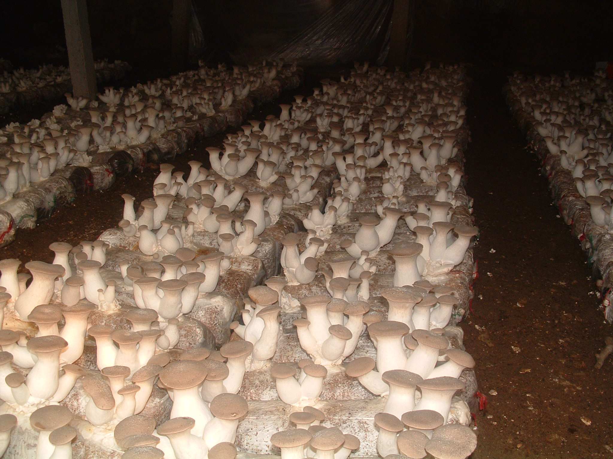 图为棚内码垛的袋装平菇