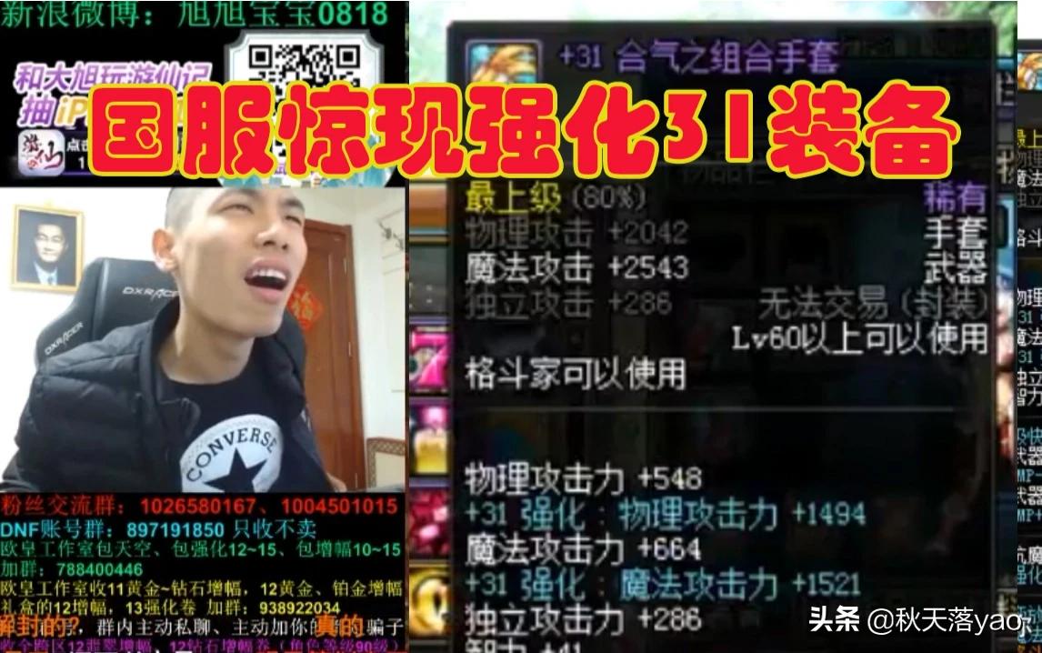 宝哥最近登陆了一个8年前被封的号,最近被释放出来的,据号主所说,他是在找回号后,装备就是31的了,有6件31,当时自己怕人不信,卖了两件,但还是抑制不住激动的心情,联系上了CEO,CEO当时就直接跟宝哥说了,宝哥直接回了CEO两个字:沙雕。后面CEO自己登陆了水友的号,发现确实是31的装备,于是宝哥就直播上了这个31的号,当晚宝哥直播间的贵宾直接狂涨到二十多万,很多水友都亲眼见证了这一刻,这就是所谓的三一真神,宝哥登陆这个号后,做了很多实验,他把31的装备进行了强化,结果却是提示无法继续强化,也解除了玩家们多年的疑问,31已经是DNF最高的了,后面又进行了街头争霸与PK,但当时被制裁了,于是第二天进行了测试,结果是硬度跟宝哥红眼差不多,但一样被超界特效秒杀,没什么区别,Pk场也一样,很容易就被打死,可能是和谐的太厉害了,不过这个号也只有4件31的,最近听说夸五出了个一身31的漫游,如果有可能,希望宝哥可以借来试试是否会有所不同,由于31装备的出现,最近宝哥以及和水友们都有了一种错觉,那就是增幅15 16 17的装备看着也就那样,一点也不刺激了!哈哈