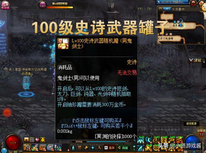 (三)当玩家刷够1000个冥渊的选择后,就可以在NPC商店兑换一个100级史诗武器随机罐,这个罐子是细化到了具体的职业系列,而且是最高级100级,与以往的绝望塔罐子完全不同,同样开启罐子也需要花费金币,这次不是100万,也不是1000万,而是300万!也就是说,100级版本的无相冥渊,将会是所有玩家必刷的副本,这里将会是获取100级毕业史诗武器的摇篮。