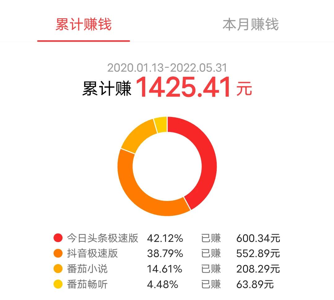 第一张截图是各个软件的总体收益,第二张截图是5月份各软件的月收益,每个软件每天一样的做任务,还是头条和抖音比较靠谱点,番茄畅听最差了。