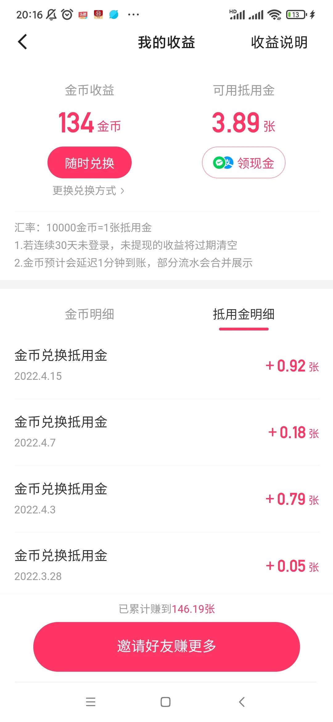 这几个App主要就是靠新用户阶段,新用户阶段可以收益10~20元,后面的话,金币数很少,一天下来也就0.1~0.5不等,如果没什么时间和耐心的话,这几个可以不用坚持,把精力放在头条极速版和抖音极速版就可以。