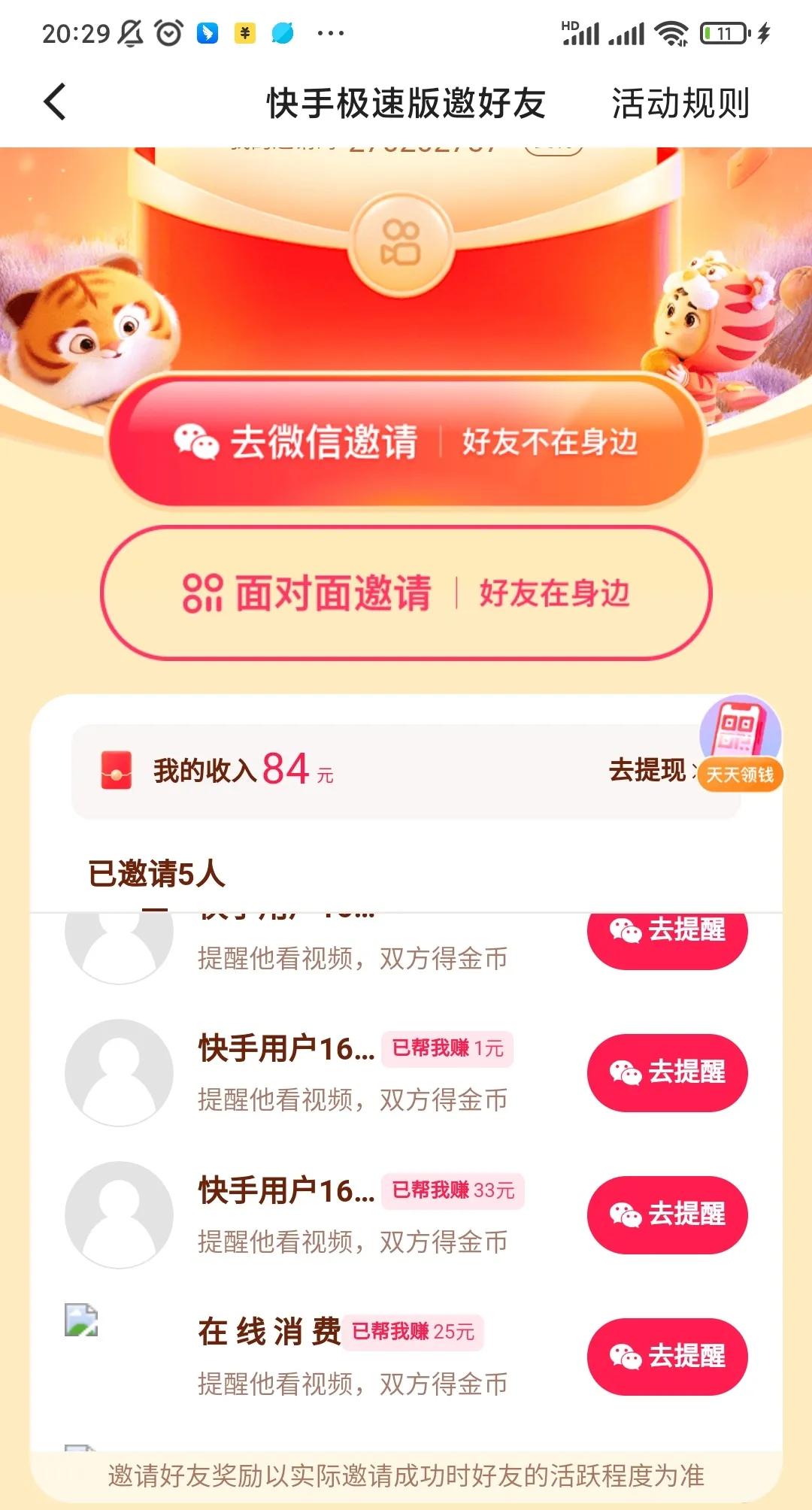 最开始玩的是快手极速版,主要是拉新,把家人的手机都下载个遍,每人25~28元一个下载,赚了84元。除了拉新用户,还可以每天赚金币,签到连续7天,金币数不同,目前只支持安卓手机有任务,坚持打卡和看广告,一天有0.5~1元钱。
