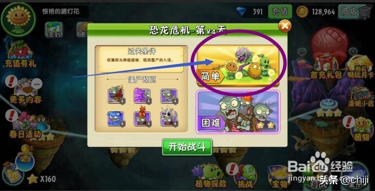 我们点击“简单”,点击开始战斗,这里面的僵尸等级只有1,过关容易些。