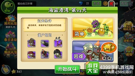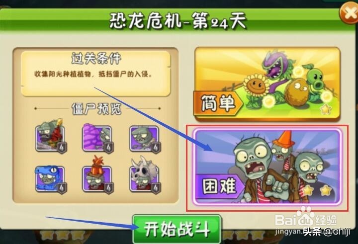 如果想过困难这一关,点击困难,僵尸会非常厉害,属于第4等级,小编还是喜欢用之前的植物,如图所示。