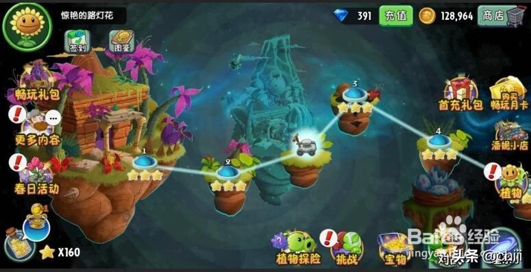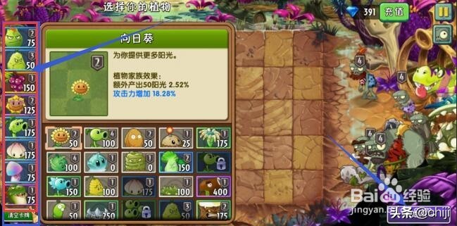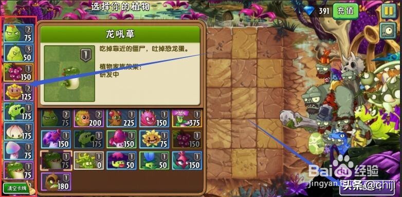 开始选择植物,向日葵是一定要选择的,原始豌豆可以让僵尸退后,并且能够整晕僵尸,所以也要选择,龙吼草可以吃掉恐龙蛋,也选择一个,其他植物如图所示。点击开始战斗。