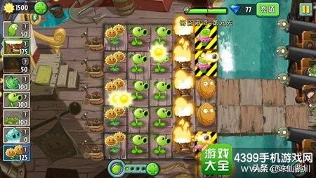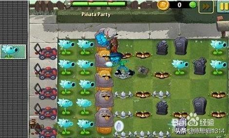 1.开始直接种双胞向日葵,种满一排,期间哪行出僵尸,哪行就种豌豆射手。坚果放在前排。