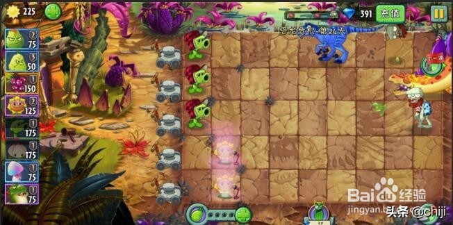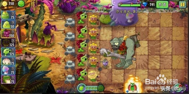 要种植向日葵,收集阳光,等僵尸出现了,种植原始豌豆,如图所示。如果恐龙蛋来了,就在恐龙蛋前面种植龙吼草吃了恐龙蛋,巨人僵尸来了就用窝瓜和能量豆,僵尸太多了,就用岩浆番石榴杀死一堆僵尸,当僵尸杀光后,就过关了。