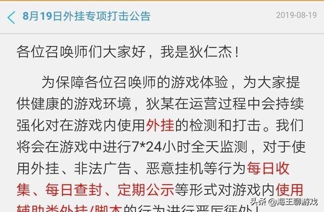 最近一段时间官方查处外挂非常的严厉,一旦发现就进行封号处理,这一点官方做得非常好毕竟破坏了游戏平衡,不然你让那些平民玩家怎么玩?也劝诫那些开挂的人就此收手,开挂一时爽,封号之后就会让你很不爽!不能一味的追求胜利而不择手段,自己有真本事才是王道!