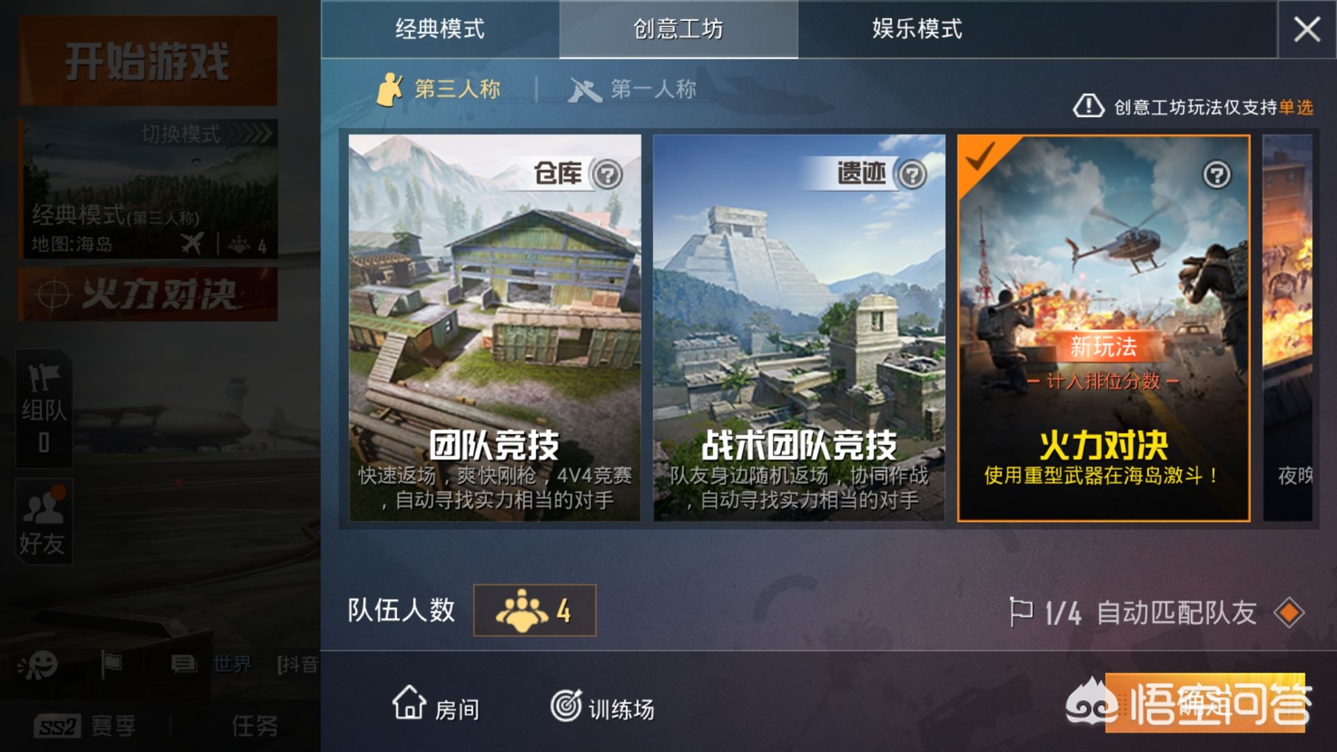 目前在《和平精英》正式服里,创意工坊模式共有3种模式,分别是4V4团队竞技、暗夜危机、队友召回模式~而在体验服的新版本中呢,在原有的3种模式基础上增加了两种新模式,分别是“战术团队竞技”、“火力对决”~而有新载具直升机的模式则是“火力对决”~