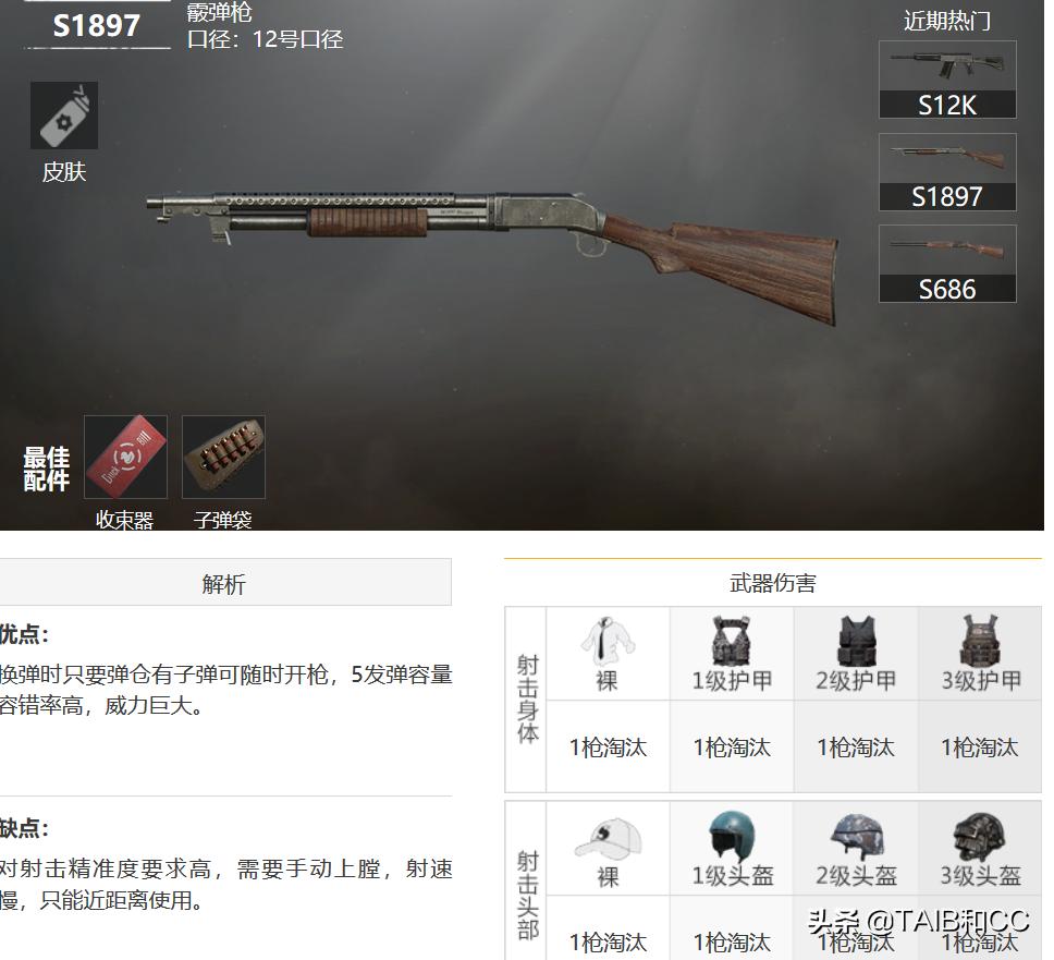 (2)、霰弹枪:霰弹枪中的三种都可以一枪打爆三级头,只要是爆头,都可以。包括是s12k,s1897,还有s686。毕竟霰弹枪的枪管粗,子弹也宽,火力猛,杀伤面积广。是近战武器中伤害最高的,没有之一,而且这种武器在经典模式中还随处可见,不用像AWM那样去捡空头。