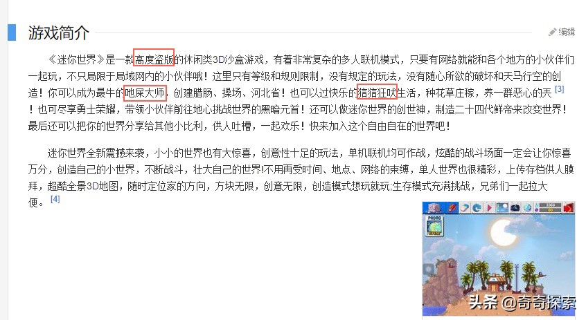 四个月前开始玩迷你世界,虽说它是抄袭的MC,但是也弥补了MC的缺点,传送门进去的快,出去的也快,虽说都是两个维度,但是就是火箭制作需要的材料太多,淘空一整个大矿洞都不一定有,再有一个就是龙太难打了,远古巨人也是