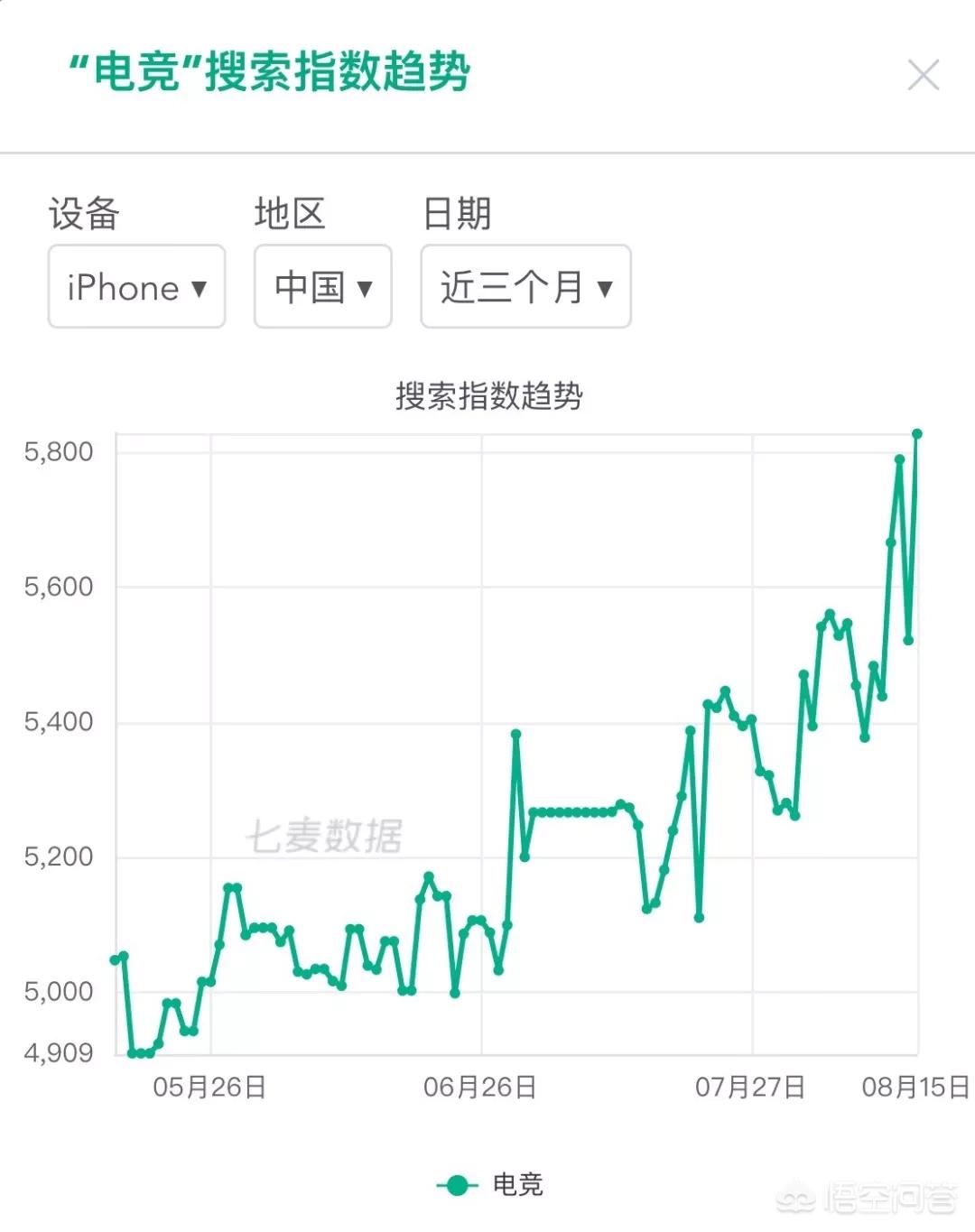8 月 6 日,据央视报道称,国内电竞用户规模已超 5 亿,市场规模超千亿。2019 年上半年,市场实际销售收入 513.2 亿元,增长率 22.8%,我国已成为世界上最有影响力和最具潜力的电子竞技市场。七麦数据显示,关键词“电竞”的搜索指数处于上升状态,用户对于电竞类 App 关注度逐渐提高。